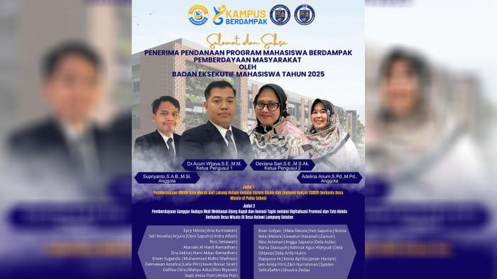 TRIBUNLAMPUNG.CO.ID, Bandar Lampung – Badan Eksekutif Mahasiswa (BEM) Universitas Indonesia Mandiri torehkan prestasi membanggakan dalam Program Mahasiswa Berdampak: Pemberdayaan Masyarakat Tahun Anggaran 2025. Dua judul inovatif berhasil meraih pendanaan dari Direktorat Riset, Pengabdian kepada Masyarakat, dan Inovasi (DRPTM), menjadi bukti nyata kontribusi…